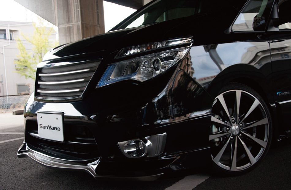 ROJAMブランドのエクステリアパーツをフルにあしらったC26後期のハイエンドカスタムコンプリートモデル。ガンメタリックカラーのシックな印象を、グリル、ホイール、リアディフューザーにいたるまで統一感を持たせたセットアップで取り入れることで、深いブラックカラーのボディが持つ高級感を一切損なうことなく、上品さを取り入れたカスタマイズに仕上がっている。